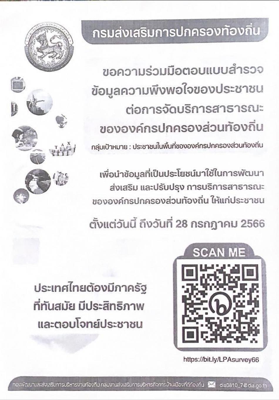 ขอความร่วมมือประชาชนในพื้นที่ตอบแบบสำรวจข้อมูลความพึงพอใจของประชาชนต่อการจัดบริการสาธารณะขององค์กรปกครองส่วนท้องถิ่น เพื่อนำข้อมูลที่เป็นประโยชน์มาใช้ในการพัฒนา ส่งเสริม และปรับปรุง การบริการสาธารณะขององค์กรปกครองส่วนท้องถิ่นให้แก้ประชาชน ตั้งแต่บัดนี้ ถึงวันที่ 28 กรกฎาคม 2566 #ประเทศไทยต้องมีภาครัฐที่ทันสมัย มีประสิทธิภาพ และตอบโจทย์ประชาชน#